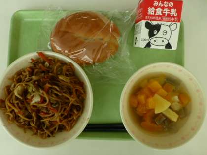 ★本日の給食★ 焼きそば こめっこパン フルーツゼリーよせ 牛乳