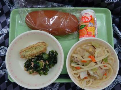 職員室で好評のちゃんぽんうどんです。人参、キャベツ、たけのこ、もやし、しいたけ、いか、さつまあげ、かまぼこなど具だくさんのうどんです。