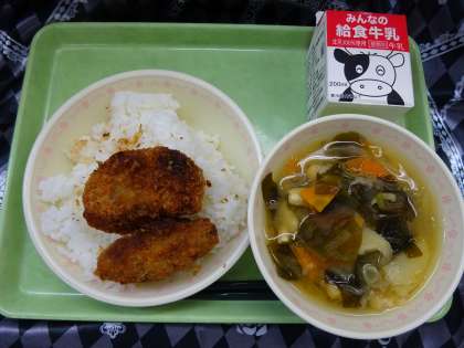わかめのみそしるの中には人参、たまねぎ、ねぎなどたくさんの野菜が入っていて、野菜たっぷりな味噌汁です。じゃがいもも入ってボリュームもあります。