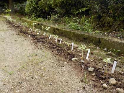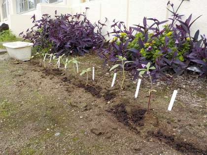 保健室、職員室前に牛乳パックで育てていたひまわりが移植されました。