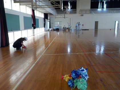 本日は、古いラインテープを撤去して、床に残ったのりを除去しています。