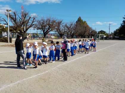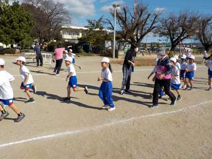 「長く走ろう」 担任の先生に続いて、校庭トラックを2周走ります。