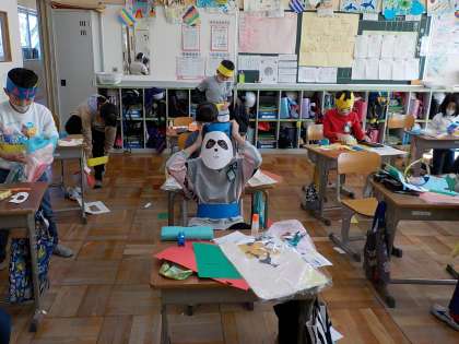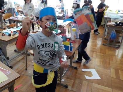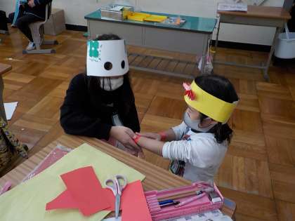 工作用紙や折り紙を使って、わっかに飾り付けをしました。