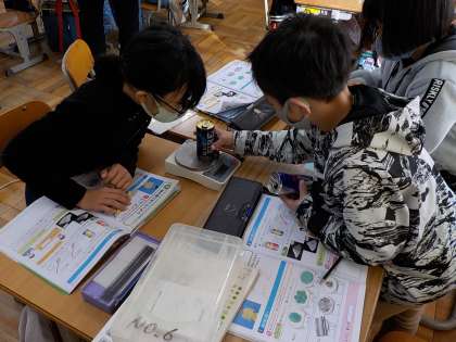 それぞれの重さをグループで軽量計を使用して調べました。