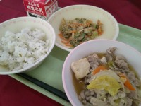11月29日は休日なので、本日11月27日(木)にすき焼きが提供されました。群馬県のぶた肉やしらたき、白菜、長ねぎなどがたっぷり入ったすき焼きは子供たちに大好評でした。白菜は、8年生が職場体験学習で種...