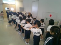 2校時、1年生は学校探検を行い、各学年の教室や特別教室などを見て回りました。担任の話をよく聞き、静かに廊下を歩く1年生。すばらしいです。