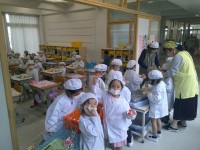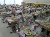1年生がはじめての給食を食べました。担任と応援職員が指導・支援に入り、子どもたちが配膳をしました。子どもたちは、皆で協力して驚くほど上手に盛り付けをし、配膳を終えました。