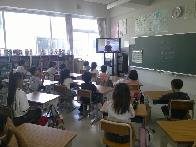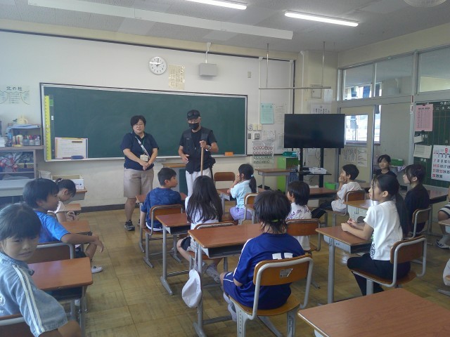 教室に戻って、スクールサポーターと校長先生から「不審者から身を守る方法や訓練の大切さ」についてのお話をしていただきました。
