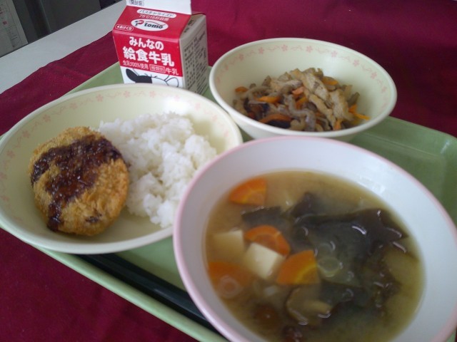「ご飯 牛乳 まぐろカツ ソース なめこ汁 きんぴらごぼう」