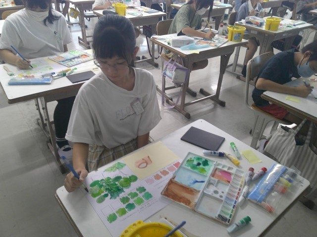 色を混ぜ合わせ様々な肌色や葉の色を作り、いろいろな技法で色を塗り重ねました。