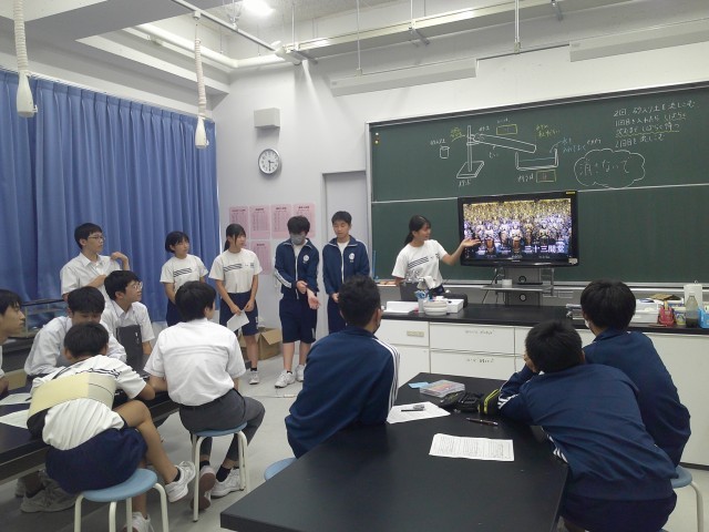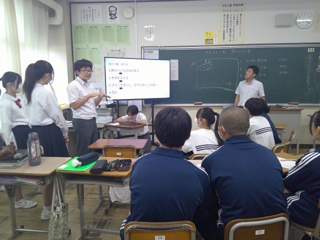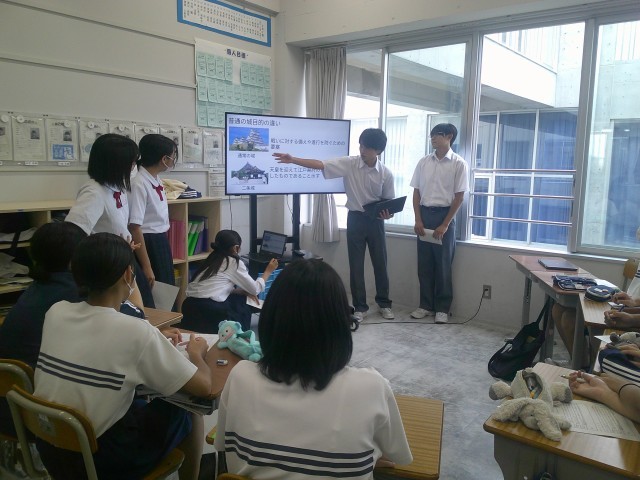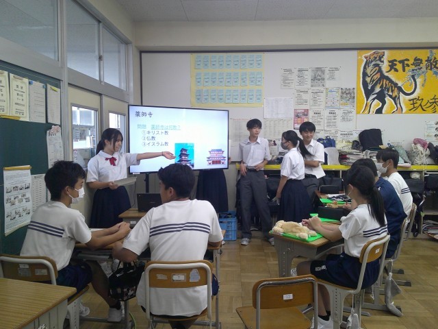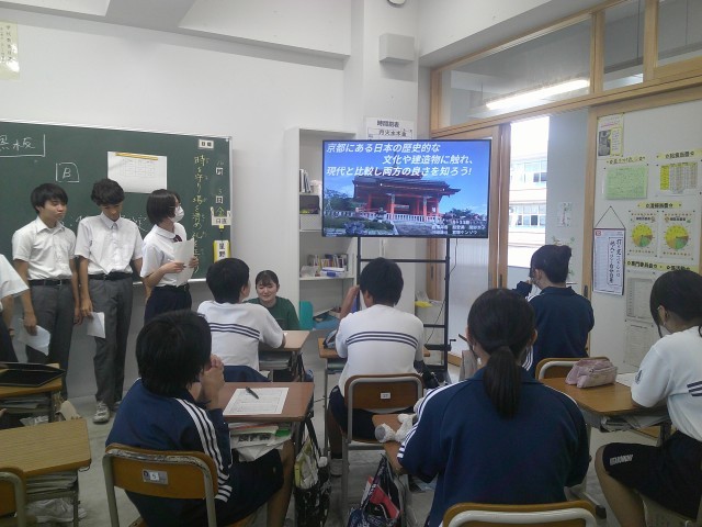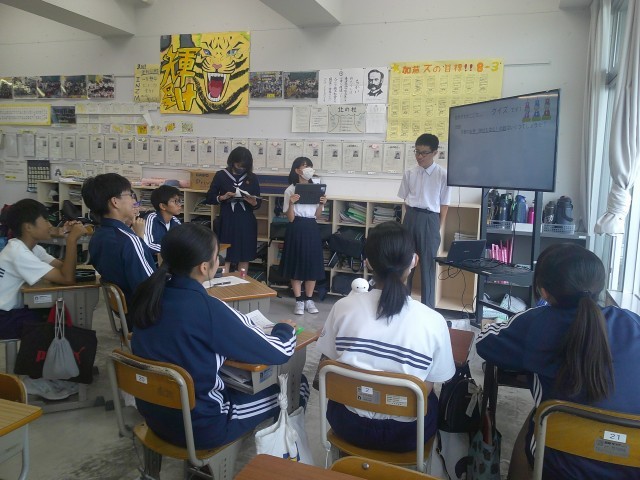 異学年交流授業 公開日 2025/10/03 更新日 2025/10/03 学校長より 総合的な学習の時間に9年生が8年生に向け、「修学旅行のまとめ」を発表しました。クイズあり、実演ありの素晴らしい発表で、8年生に「京都・奈良について調べ、修学旅行に行ってみたい!」という気持ちを喚起させていました。 +3