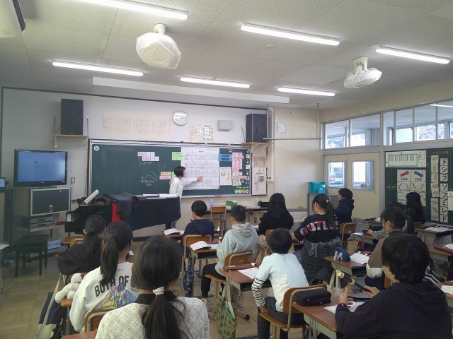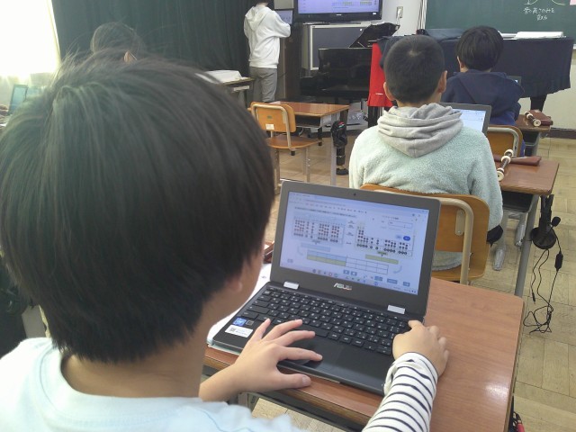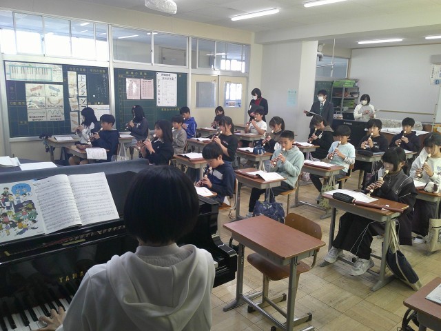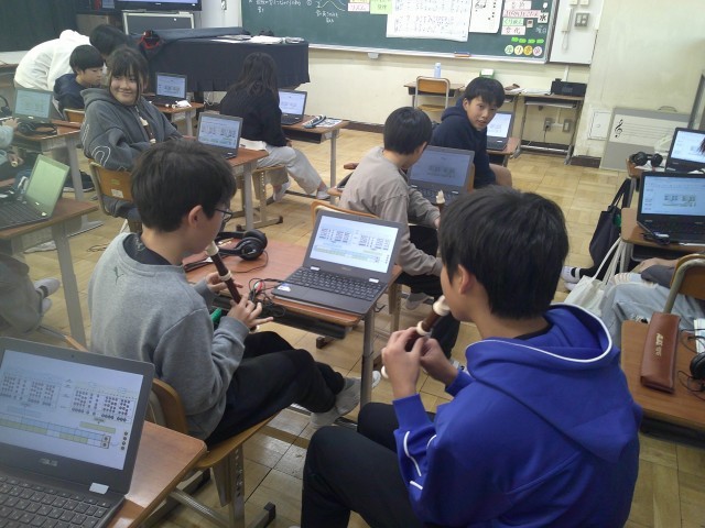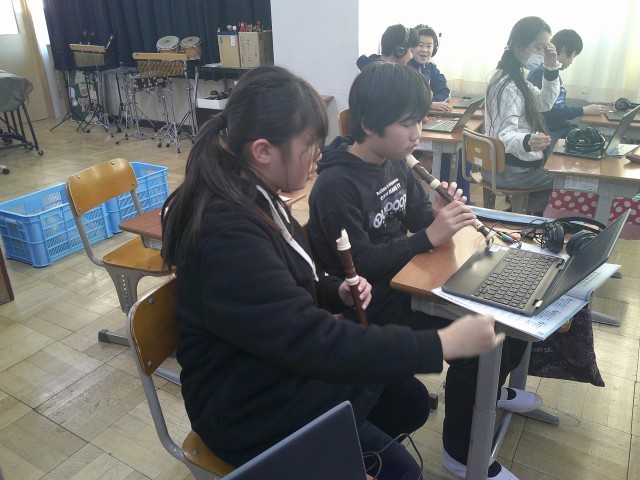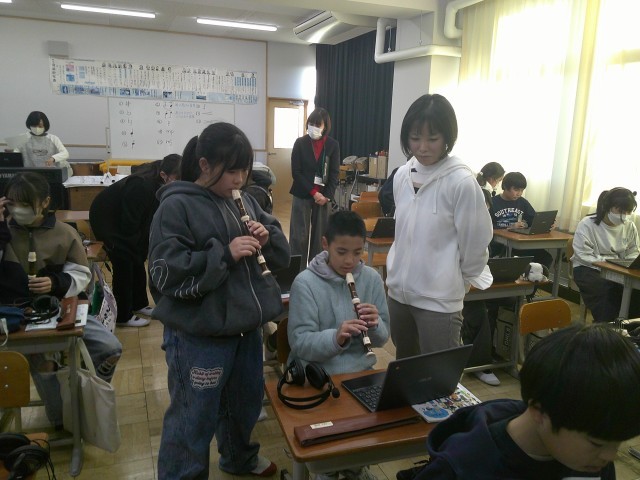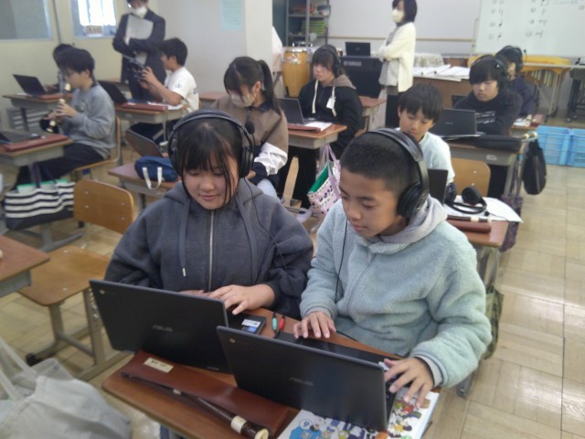 6年生 音楽♬ 公開日 2025/11/19 更新日 2025/11/19 学校長より めあて「2つの旋律をずらしたり、重ねたりしながらおんがくをつくろう」まずは、リコーダーでタンギング練習その後、「同じ旋律をずらす」か「リズムは同じで、音の高さを変える」の条件を選んで、タブレットを使って旋律を作りました。ペアで聴きあい、最後は作ったものをリコーダーで発表しあいました。発表できたペアは、温かい拍手をもらっていました。 +5