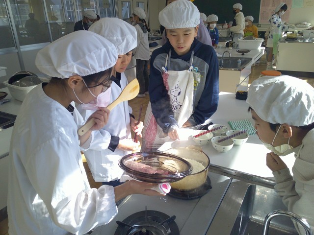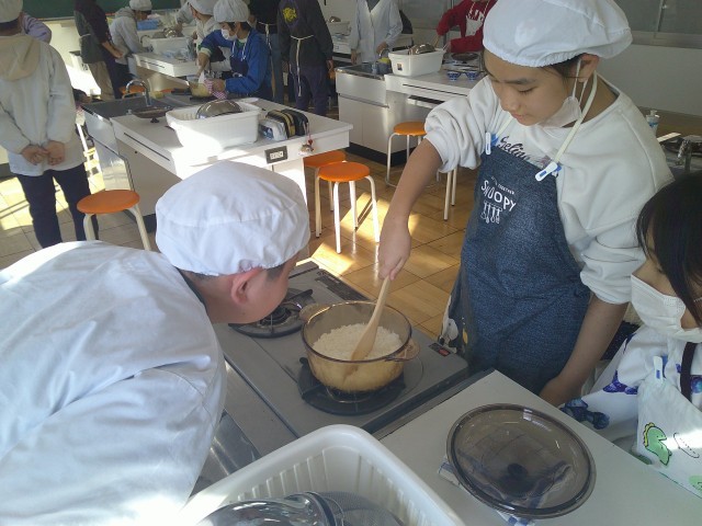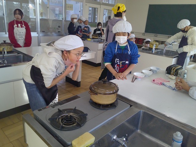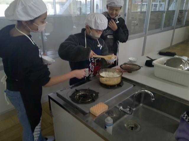5年生 家庭科🍚 公開日 2026/01/13 更新日 2026/01/13 学校長より 今日の家庭科は調理実習です。めあては「ふっくら、おいしいご飯を炊こう」強火で泡が出てきてから弱火にしたり、炊いている途中のご飯の匂いを確かめたり、とっても楽しそうに取り組んでいました。どの班も上手に炊くことができました。鍋で炊くご飯はとってもおいしいですね。 +7
