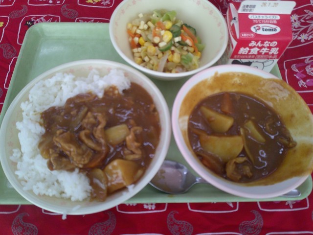 「ご飯 牛乳 ポークカレー カラフルサラダ」