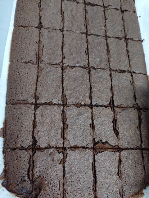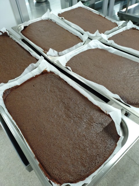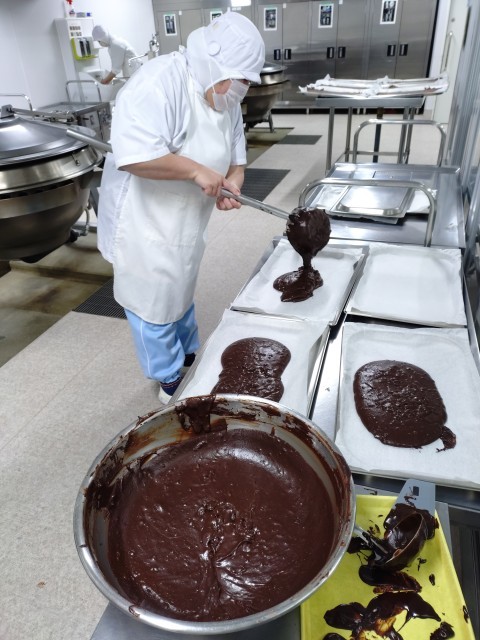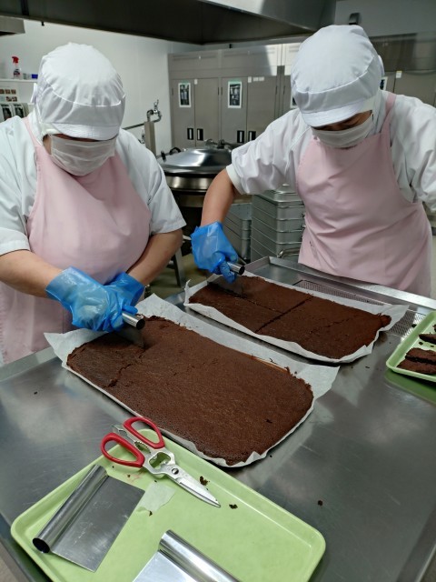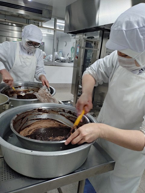 給食室のオーブンでブラウニーを焼きました! 公開日 2026/02/12 更新日 2026/02/12 給食室より 今日は、給食室のスチームコンベクションオーブンを使ってブラウニーを手作りしました。 湯せんにかけながらたくさんのチョコチップをとかして生地を作りました。 チョコレートは冷めると生地がかたまりやすく、鉄板に均等にのばすのに少し苦戦しましたが、チョコレートたっぷりなので、濃厚でしっとりとしたブラウニーができました。 おいしくできてよかったです。 +3