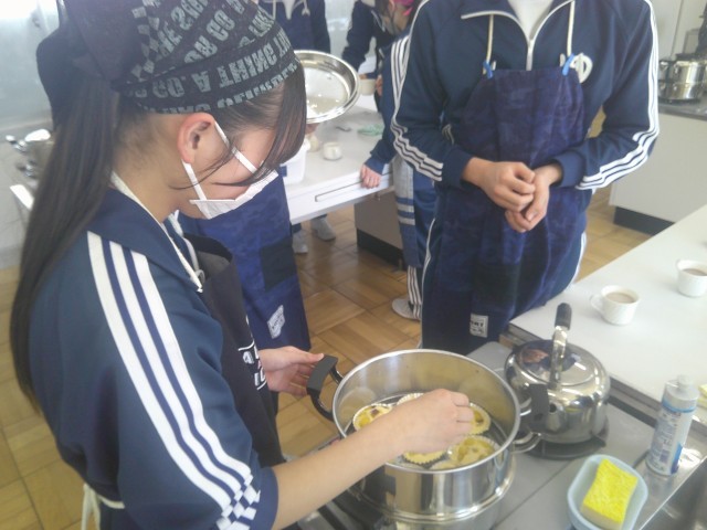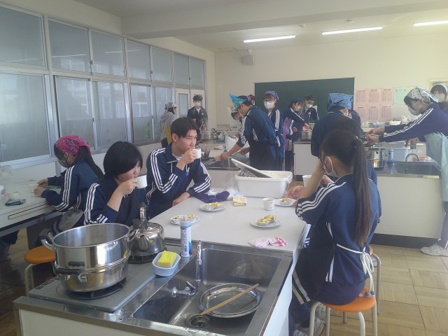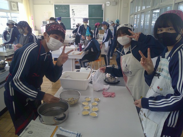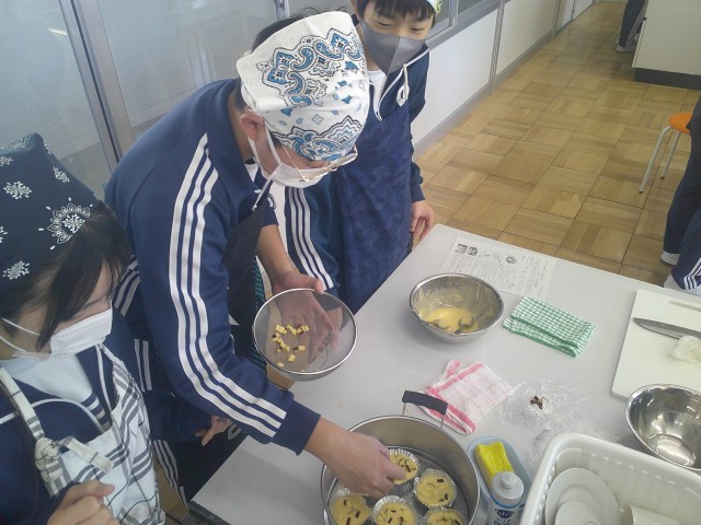 9年生 家庭科 公開日 2026/02/13 更新日 2026/02/13 学校長より 幼児のおやつ「さつまいもの蒸しパンを作ろう」ほんのり甘く、おいしい仕上がりとなりました。義務教育最後の調理実習、みんなで協力できてよかったですね。 +3