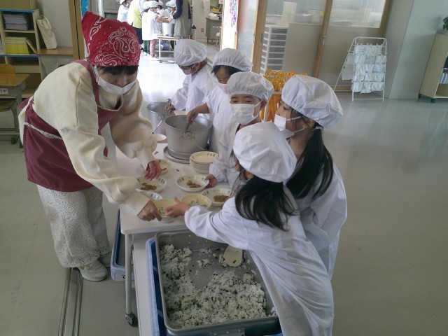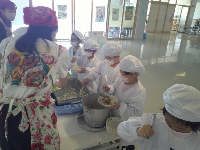 担任と応援職員が指導・支援に入り、子どもたちが配膳をしました。