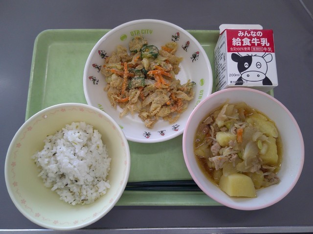 肉じゃが、ごまあえ、菜めし、牛乳、です。