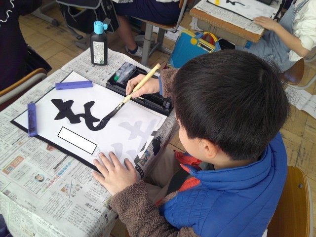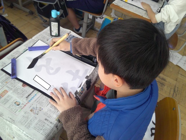書き初め練習が始まりました。まずは文字の大きさがわかるよう、なぞり書きから始めていました。