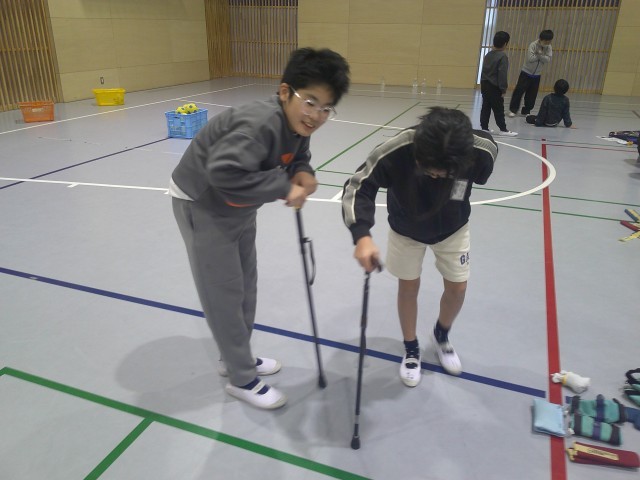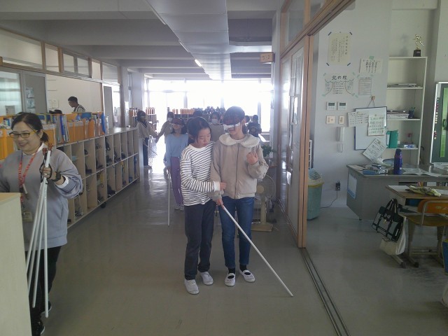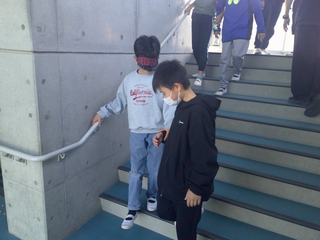 ○高齢者疑似体験・・・・前回の福祉学習を生かして、「点字ブロックがあるよ。」や「あと、3歩先に階段があるよ。」など