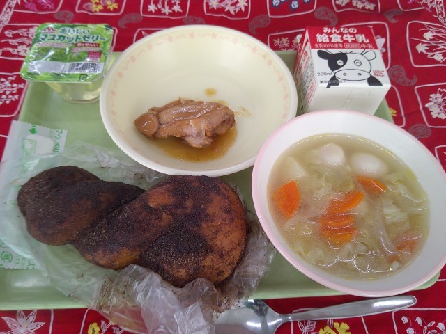 「ココア揚げパン 牛乳 照り焼きチキン ABCスープ マスカットゼリー🍇」