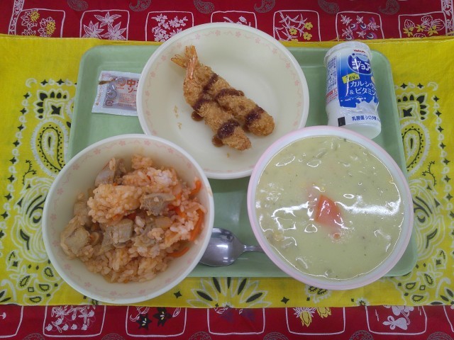 「チキンライス ジョアプレーン エビフライ ソース コーンクリームスープ🌽」