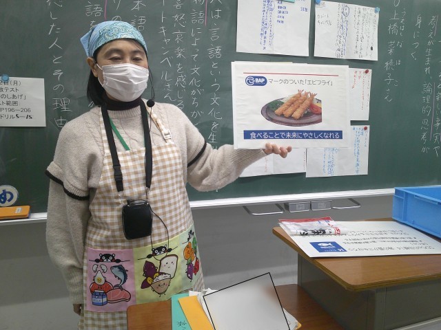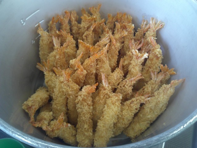 調理員さんが1,400本を揚げてくれ、尻尾までおいしいエビフライでした。(尻尾は好みで食べてもよし、残してもよしです。)