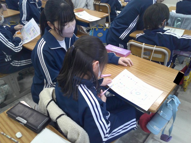4月に入学する新1年生のためのプレゼント作りです。頼もしい9年生のお兄さん、お姉さんと一緒に作れてよかったですね。