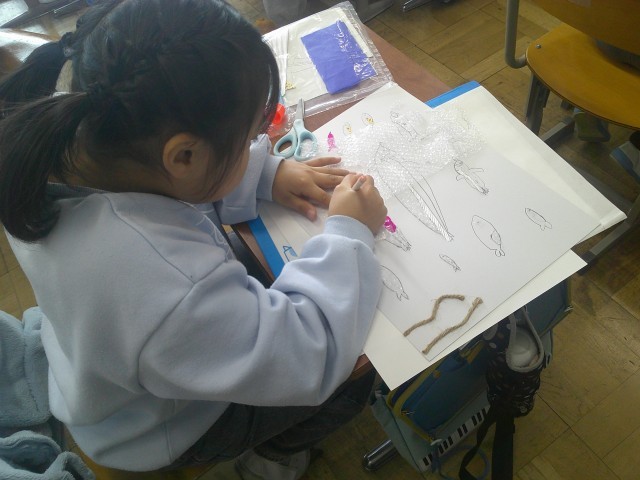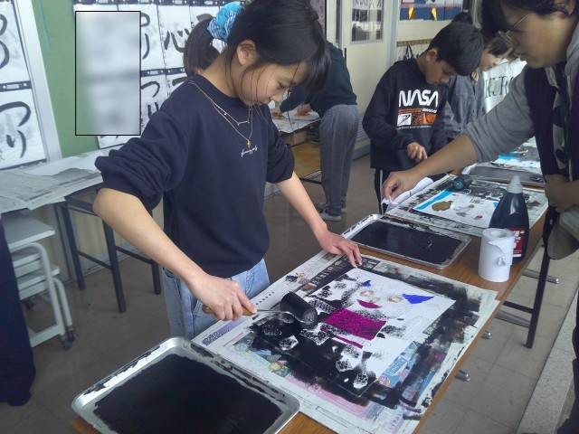 紙や段ボール、毛糸、プチプチ(緩衝材)など凹凸のある材料を土台に貼り付けて「版」をつくり、