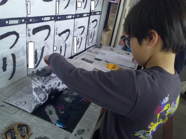 黒いインクを塗って、紙に写し取ります。初めての体験にドキドキしながらも頑張っていました。