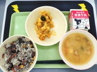 今日は、群馬クレインサンダーズとのコラボ給食です。 チームカラーの黒や黄色の食材を使った献立にしました。 サンダめしは、黒ごまをたくさん使ってチームカラーの黒をイメージしました。 汁物は、中村 拓人...