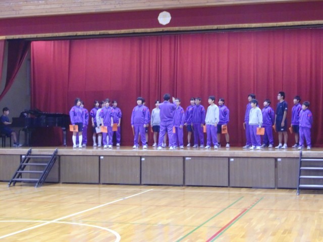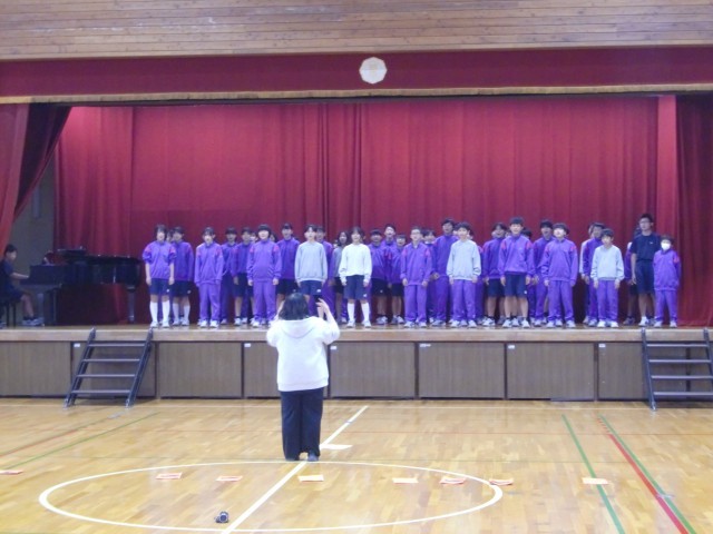 学年合唱「怪獣のバラード」のあと、クラス合唱(1年B組「マイ・バラード」、1年A組「変わらないもの」)を聴き合いました。歌詞を伝える合唱を目標に取り組んでいました。