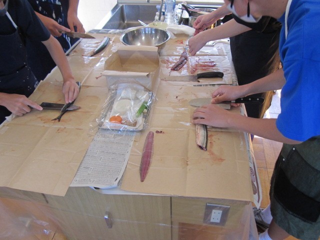 とりせんの松島さんと田中さん、桐生市場の新藤さんを講師にお招きし、秋刀魚のつみれ汁を教えていただきました。松澤さんには、生徒たちに3つの感謝の心を大切にして調理するよう話していただきました。3つの心とは、生き物に感謝する心、一緒に調理してくれる友達への感謝の心、漁業や商業、流通など調理実習に関わったすべての人に感謝する心です。生徒たちは、そういう気持ちをもって調理実習に取り組みました。