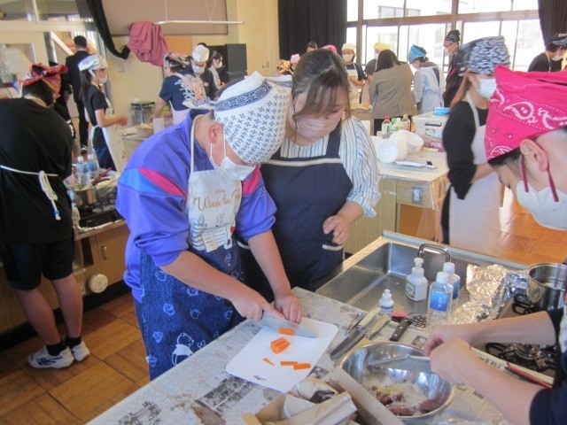 講師の方にきめ細かな支援をしていただいたり、グループで助け合ったりしながら、つみれ汁を作っていました。