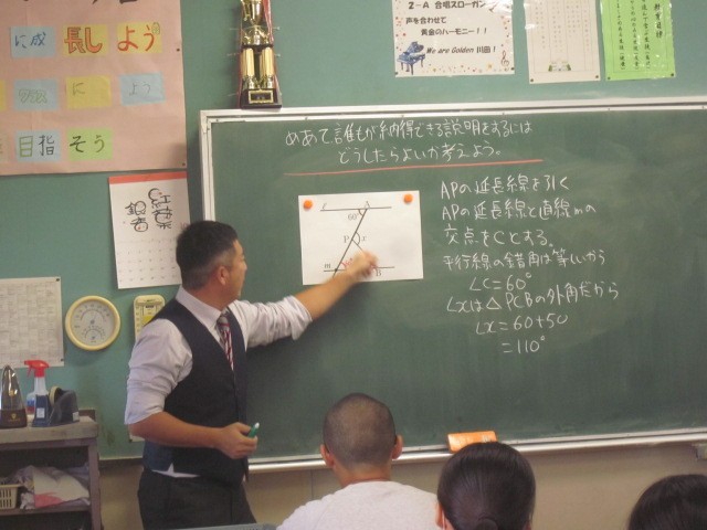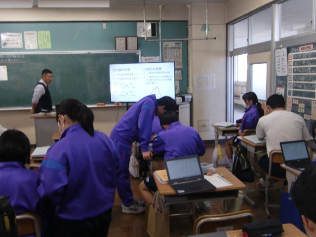 27日(月)は学校指導訪問でした。太田市教育委員会の指導主事に訪問いただき、3校時に2年生の数学で研究授業を行いました。「主体的に学びに向かう生徒の育成~生徒が学習課題や学習成果を実感できる研修活動の工夫を通して~」の研修テーマに迫るべく、単元の導入で取り組んだ問題に再び取り組み、過去の自分と比較する活動を通して、根拠を明らかにして説明する力を身につけることができるようにする授業案をもとに、授業を行いました。授業を通して、単元導入時と授業後の自分の変化を感じたり、友達と説明し合うことを通して新たなものの見方に気付いたりする生徒の姿が多く見られました。