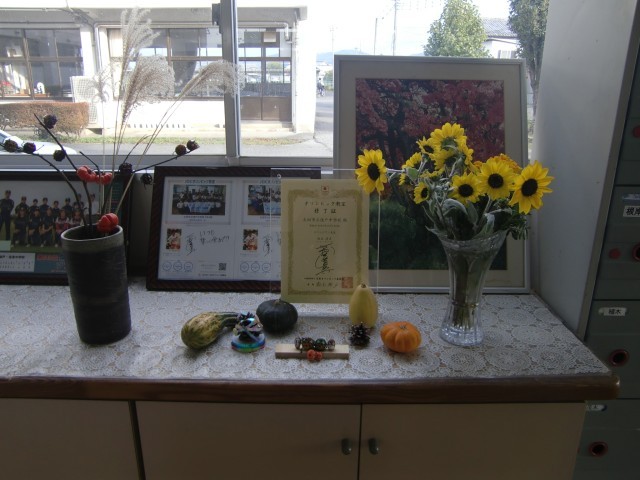 カボチャや木の実に混じって、ひまわりが咲いていることが何とも不思議な感じがしますが、季節は秋、そして冬へと向かっていきます。