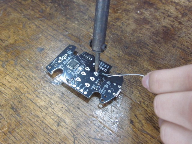今日は,その製作の中で最も神経を使う基盤部分の「はんだ付け」です。繊細な作業の上,初めて作業する生徒がほとんどなので、とても緊張しています。ヤケドをしないように気を付けてはんだごてを持ち、付けるハンダが多すぎたり少なすぎたりしないように気を付けて、真剣な表情ではんだ付けをしていました。はんだ付けが上手にできると、「ふうーっ。」と大きく息をはきます。この緊張感と達成感が気に入ったようで,とても楽しそうに作業していました。
