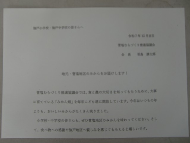 「菅塩むらづくり推進協議会」のみなさまより、強戸小・中に、みかんをいただきました。