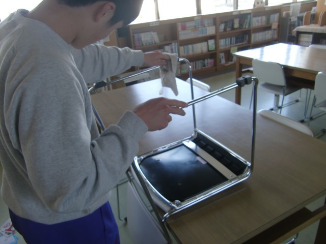 職員室や校長室、他の教室のお手伝い、図書室の椅子のほこり取りなど、隅々までていねいに行っていました。
