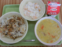 2/20(火)の給食は 麦ごはん ポークカレー リンゴジュース カレー屋さんの謎ドレッシングサラダ でした