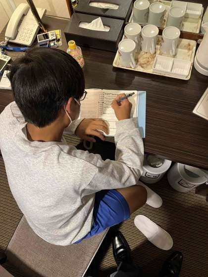 部屋で一日の振り返りをしています。