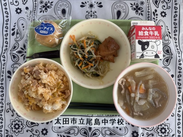 今日の給食は、キムタクご飯、牛乳、照り焼きチキン、ナムル、豚汁、シューアイス、ミルメークです。