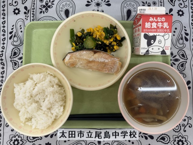 今日の給食はご飯、牛乳、鮭の塩焼き、ほうれん草とコーンのおひたし、けんちん汁です。