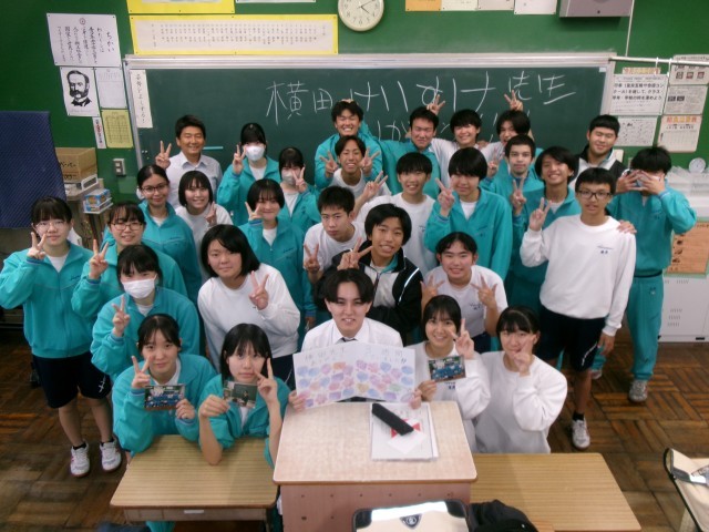 一番下の写真は先週、3週間の教育実習を終えた実習生と3年生のクラス写真です。