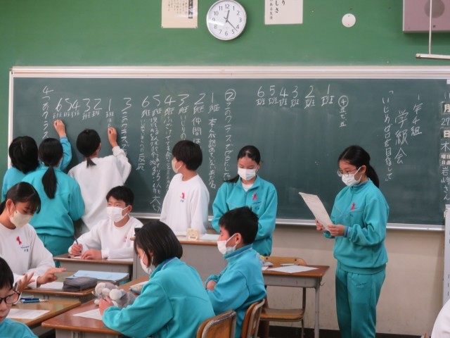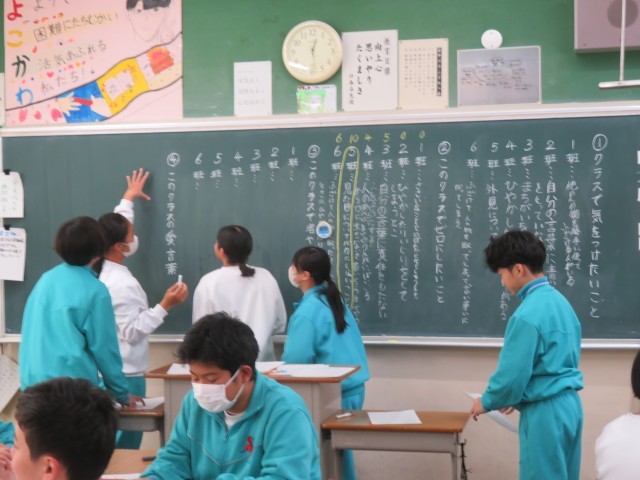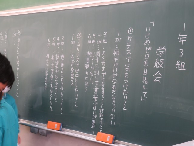 「いじめゼロを目指して」各クラスで気をつけたいこと、ゼロにしたいことについて話し合いをしました。