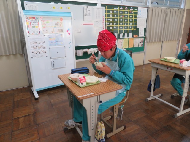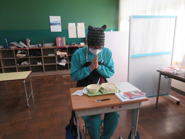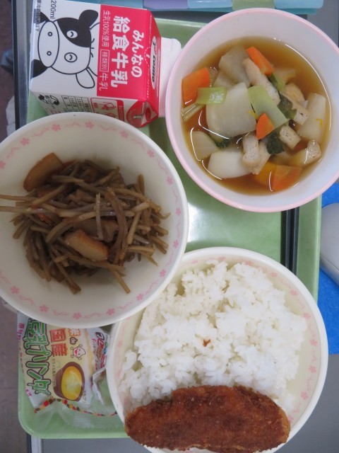 本日は8組のリクエスト献立。白身魚のフライ、ごぼうのきんぴら、根菜の味噌汁、豆乳プリンタルトでした。