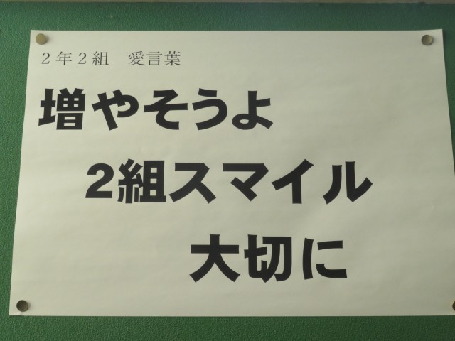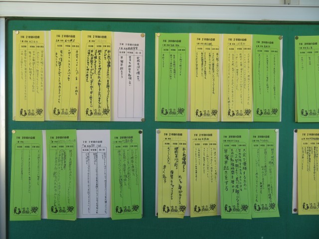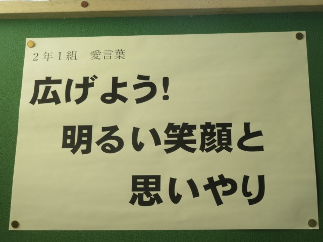 1,2年のフロアには、3学期の目標やクラスで決めた愛言葉の掲示がされれています。
