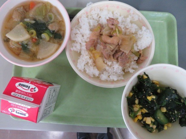 今日の給食は「おおたをたべようの日」で 太田のネギで焼き鳥煮 山吹和え 太田市野菜のいわしのつみれ汁 でした!