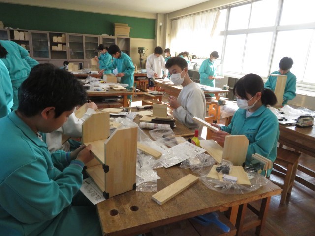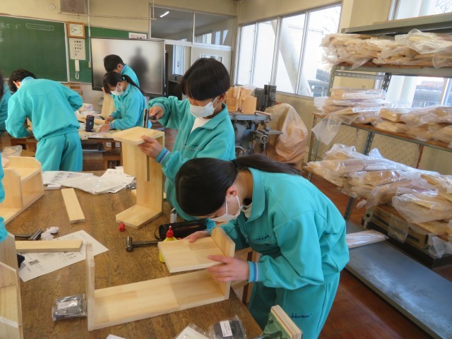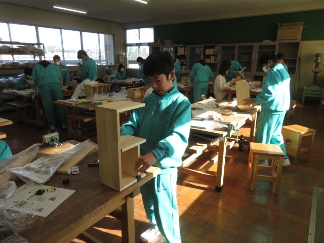 1校時の1年生技術で本棚を作成中です。