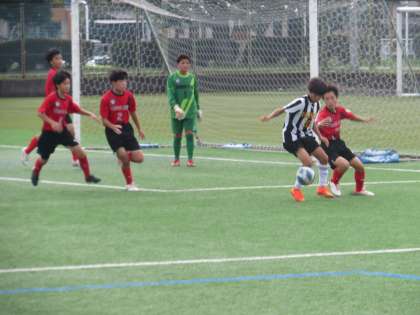 ゴール付近に蹴られたボールを追った宝泉中の選手
